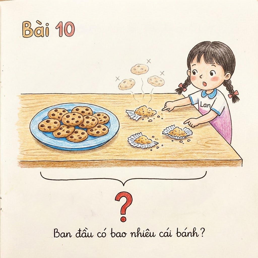 Bài 10: Lan có một số bánh. Buổi sáng bạn ấy đã ăn 3 cái bánh thì còn lại 8 cái bánh. Hỏi ban đầu bạn Lan có bao nhiêu cái bánh?