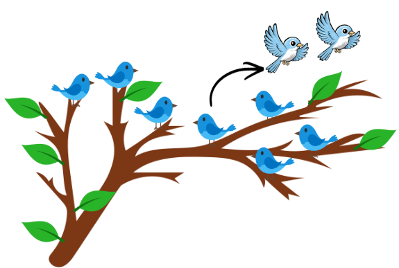 Bài 2: Ban đầu, trên cành cây có 9 con chim. Một lúc sau, bay đi mất 2 con chim. Hỏi bây giờ, trên cành cây còn lại bao nhiêu con chim?